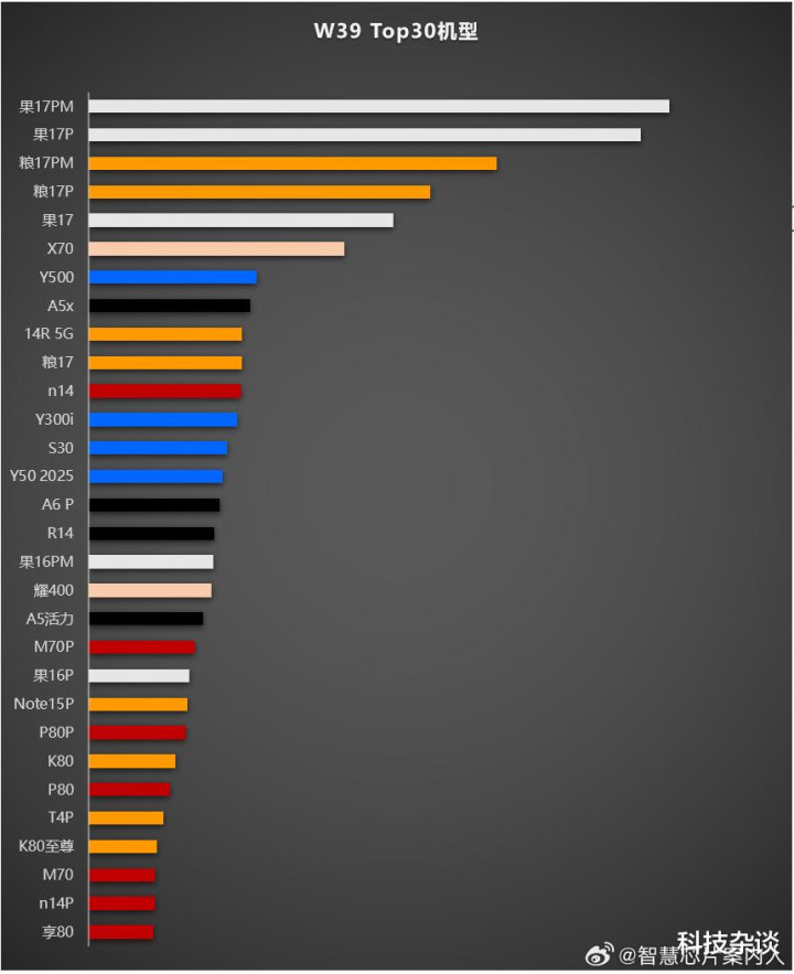 更牛的是在W39周单品销量前五的机型全部被苹果与小米霸占,来自行业人士“智慧芯片案内人”的数据显示。这一周单品销量排名第一的机型是iPhone 17 Pro Max,排名第二的是iPhone 17 Pro,排名第三的是小米17 Pro Max,排名第四的是小米17 Pro,排名第五的是iPhone 17。看到了吗?这就是“17”的威力所在,它们一商用其它机型全部靠边站。更令人感到欣慰的是小米17 Pro系列的销量已经超越了iPhone 17。遗憾的是小米17这一次略有下降,即使这样也是单品销量排名第十的机型。